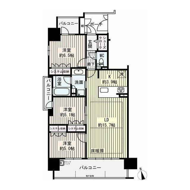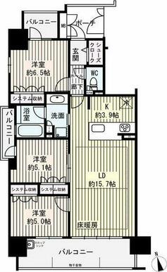 | 間取り | 3LDK(LDK15.7、K3.9、洋6.5、洋5.1、洋5) | 主要採光面 | 南 |